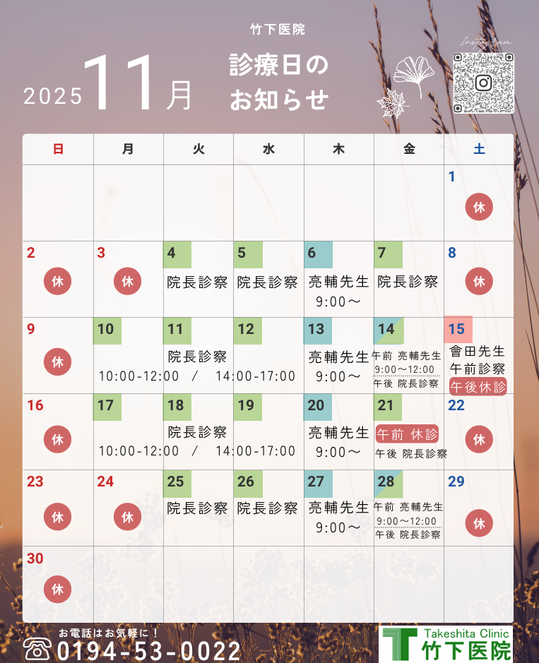 11月診療カレンダー 11月の診療カレンダーです。 予約制となっておりますので、事前にお電話でのご予約を宜しくお願い致します。 また、2階のかんたき「までっこ」へのエレベーターが完成となります。 工事期間中は、騒音や振動等でご不便をおかけいたしました。ご理解とご協力を賜り、誠にありがとうございました